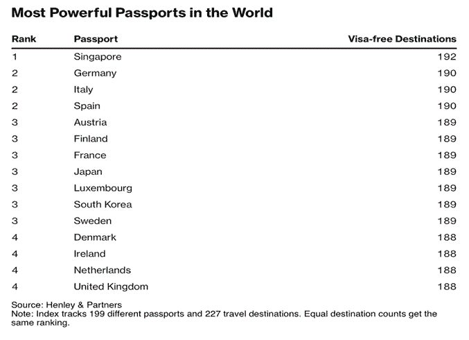 “Singapore Passport Is World’s Most Powerful, Replacing Japan – Singapore has replaced Japan for having the world’s most powerful passport, allowing visa-free entry to 192 global destinations, according to the latest Henley Passport Index. The US, which once topped the ranking nearly a decade ago, slid two places to eighth place. The UK, after a Brexit-induced slump, jumped two places to fourth, a position it last held in 2017.”, Bloomberg, July 18, 2023