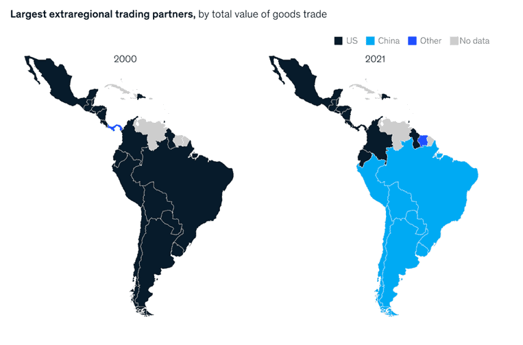 “What could a new era mean for Latin America? The pandemic hit Latin America hard, inflation has raised pressure on the continent’s low-income groups, and polarizing political tensions have been escalating. In Latin America, as in the rest of the world, these are volatile and uncertain times. Increasing trade with China and the rest of the world has shifted the balance away from the United States.”, McKinsey & Co., July 20, 2023
