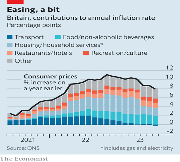 “British inflation may not be as sticky as thought – Inflation figures covering the year to June showed that the rate of price growth is not proving as stubborn as it had previously appeared. The headline rate of inflation fell from 8.7% in May to 7.9% in June, a bigger drop than the fall to 8.2% that economists had been expecting.”, The Economist, July 19, 2023