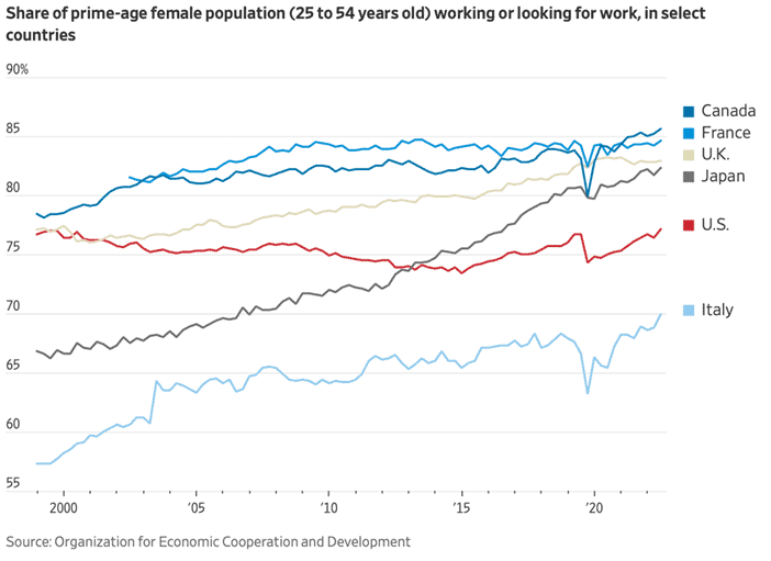 “Americans in Their Prime Are Flooding Into the Job Market – Share of people between 25 and 54 working or seeking jobs rose this year to highest level since 2002. The resurgence of midcareer workers is driven by women taking jobs. The labor-force participation rate for prime-age women was the highest on record, 77.8% in June. (US) Men, however, tend to be employed at higher rates. The overall prime-age participation rate rose in June to 83.5%, the highest since 2002.”, The Wall Street Journal, July 22, 2023