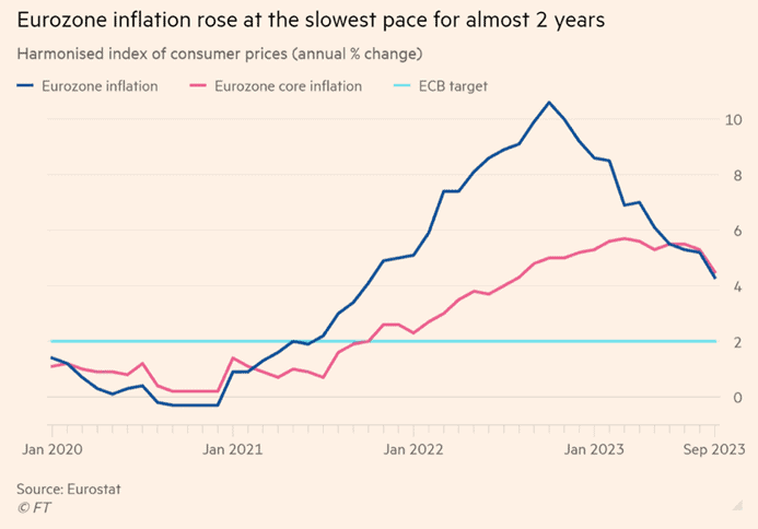 “Eurozone inflation hits 2-year low as US price pressures ease – Data helps steady bond markets and signals prospect of end to interest rate rises on both sides of Atlantic. The last time inflation was lower was in October 2021. US data also bolstered hopes that the biggest surge in consumer prices for a generation is fading fast. ‘The main takeaway is that the tightening cycle is coming to an end,’ said Seema Shah, chief global strategist at Principal Asset Management.”, The Financial Times, September 29, 2023
