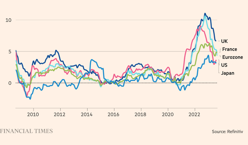 “Global inflation tracker – Inflation is easing from the multi-decade highs reached in many countries following Russia’s full-scale invasion of Ukraine. The latest figures for most of the world’s largest economies show the wholesale food and energy prices that soared during 2022 are now falling back.”, The Financial Times, September 29, 2023