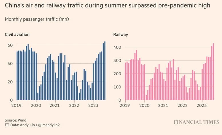 “China hopes Golden Week holiday will deliver economic boost – Surge in consumer spending could spill over into fourth quarter and help ailing property sector. Economists will be watching in particular whether Chinese consumers will use the eight-day break, which combines the October 1 National Day and the mid-Autumn festival holidays, to spend not only on restaurants and outings but also on bigger ticket items, particularly property.”, The Financial Times, September 29, 2023
