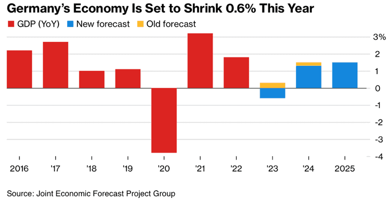 “German Economy to Shrink 0.6% in 2023 Before Wages Drive Rebound – Purchasing power to fuel 1.3% growth next year, institutes say Inflation expected to slow to 2.6% in 2024, 1.9% in 2025. Germany’s economy is on course for its first full year of contraction since the pandemic, new forecasts showed, though rebounding consumption should spur a recovery in 2024.”, Bloomberg, September 28, 2023