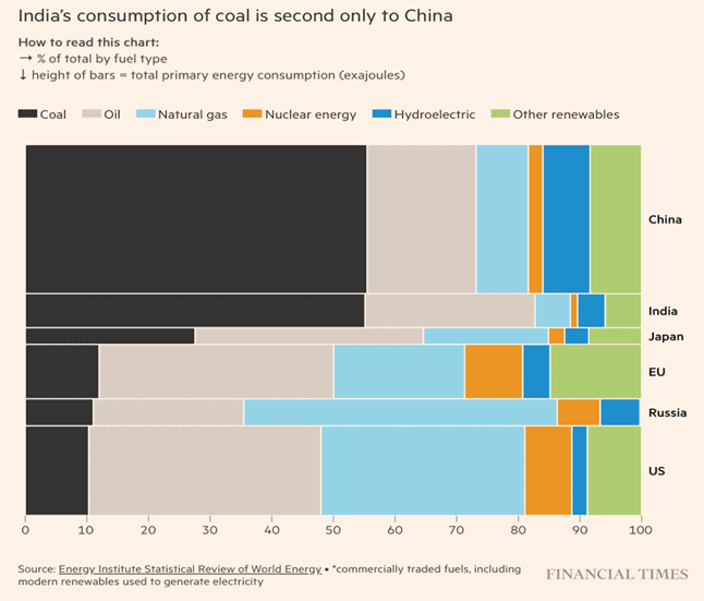 “India’s dream of green energy runs into the reality of coal – The fossil fuel accounts for around three-quarters of power generation and demand is expected to grow, despite an ambitious renewables plan. Prime Minister Narendra Modi has laid out an ambitious target to build 500 gigawatts of non-fossil fuel capacity by 2030. India has also announced billions in subsidies to manufacture clean-energy technology and wants to become a leading green hydrogen exporter. Yet India’s energy transition is complicated by intractable problems, from the difficulty of acquiring land for solar and wind farms to deep financial distress in its power system, which slows new investment. While demand is surging, millions still lack access to reliable electricity. Authorities see the expansion of polluting industries like steel and cement as essential to creating jobs and economic growth.”, The Financial Times, September 24, 2023