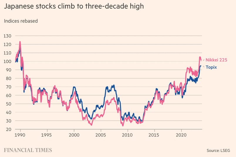 “A breakout year for Japanese stocks – After a series of false dawns, investors sense a long-awaited shift in the Tokyo market. But everything has come together this year, despite the very clear consensus that 2023 would be similarly drab. The Topix and Nikkei 225 are both up more than 20 per cent so far this year. That drops in to single figures in dollar terms but this remains a breakout year.”, The Financial Times, September 29, 2023