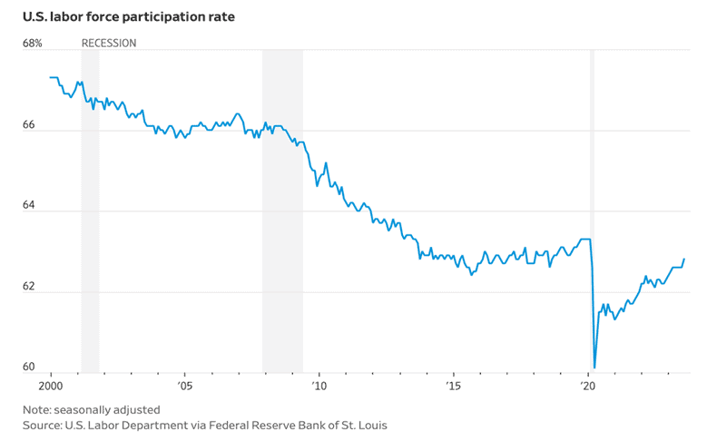“Why America Has a Long-Term Labor Crisis, In 6 Charts – Participation hasn’t fully recovered from pandemic-era losses, though there have been signs of growth for prime-age workers—those between ages 25 and 54. The overall participation rate is expected to drop to 60.4% in 2032, according to the Labor Department, mainly because of baby boomer retirements. Wages reflect supply and demand. They shot up during the pandemic recovery and have recently outpaced inflation, which gives workers more spending power. Long-term labor shortages could lead to a faster pace of wage growth for the foreseeable future.”, The Wall Street Journal, September 25, 2023