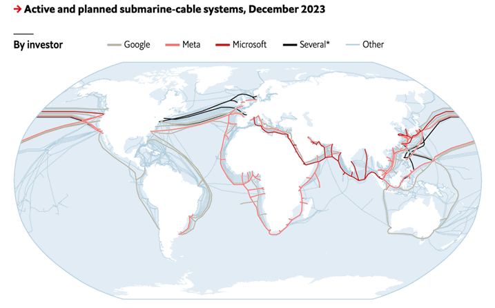 Big tech and geopolitics are reshaping the internet’s plumbing – Data cables are turning into economic and strategic assets. Submarine cables used to be seen as the internet’s dull plumbing. Now giants of the data economy, such as Amazon, Google, Meta and Microsoft, are asserting more control over the flow of data, even as tensions between China and America risk splintering the world’s digital infrastructure. The result is to turn undersea cables into prized economic and strategic assets.”, The Economist magazine, December 20, 2023