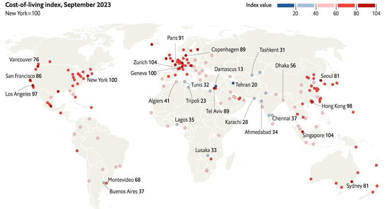 These are the world’s most expensive cities – EIU’s cost-of-living index shows where prices are highest. Tied in first place this year were Singapore and Zurich. Western European cities, including Copenhagen, Dublin and Vienna, take around half of the top 20 spots. The three biggest climbers were Santiago de Querétaro and Aguascalientes in Mexico, and Costa Rica’s capital, San José. Beijing was one of four Chinese cities among the ten biggest decliners in the ranking.”, The Economist, November 29, 2023