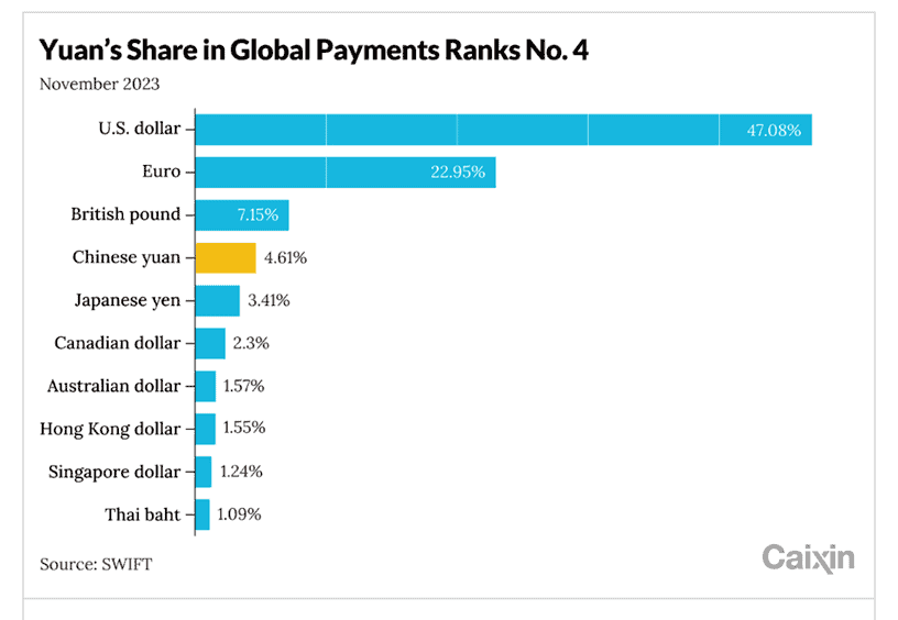 China’s Yuan Overtakes Yen to Rank Fourth for Global Payments – The yuan overtook the Japanese yen to become the fourth-most used currency by value in global payments for the first time in almost two years, according to a monthly tracker of the Chinese currency released by the Society for Worldwide Interbank Financial Telecommunication (SWIFT).”, Caixin Global, December 22, 2023