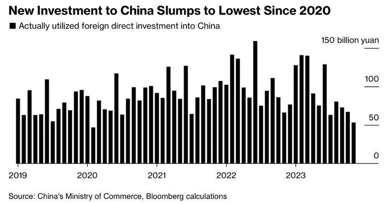 China’s Foreign Direct Investment Drops to Near Four-Year Low – A measure of foreign investment into China fell to the lowest in nearly four years in November, underlining how geopolitical tensions and a slowing economy have combined to convince foreign companies to slow their expansion. New actually utilized foreign capital received by the country was 53.3 billion yuan ($7.5 billion) last month, down 19.5% from a year earlier, according to Bloomberg calculations based on data published by the Ministry of Commerce on Thursday. That’s the worst number since February 2020, when the Covid-19 pandemic first hit.”, Bloomberg, December 21, 2023