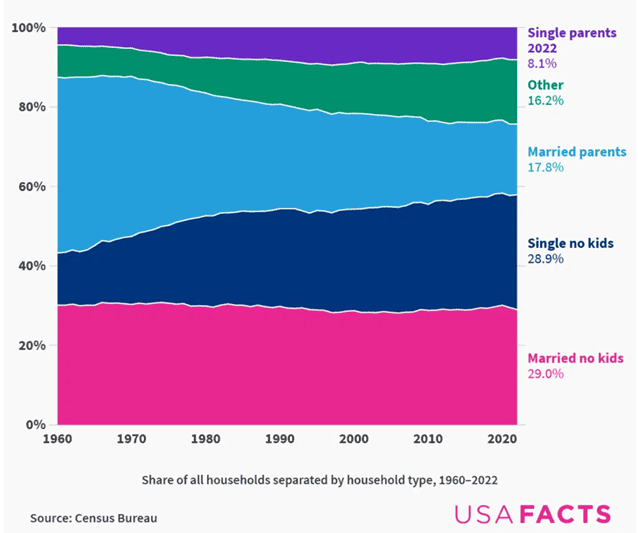 How has the structure of American households changed over time? In 2022, more than half of American households were childless: 29% were married households without children, and 28.9% were single households without kids. More than a quarter of households included parents — 17.8% were married households, while 8.1% were single-parent households. In 1960, households with married parents represented over 44% of all American households, while slightly over 13% were single with no children. Today, that’s inverted — in 2022, single people living alone and married couples without children outnumbered married-parent households.”, Voronoi – USA Facts, December 12, 2023